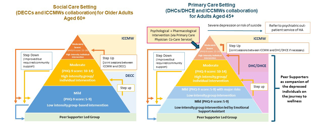 Those at-risk of depression are offered psychoeducation groups (e.g. sleep and pain management) at DECCs or DHCs/DHCE, and are encouraged to join the Ambassador training programme to enhance their mental health literacy. For individuals with mild depressive symptoms, low-intensity psychological intervention is provided at DECCs or DHCs/DHCE. For those with moderate depressive symptoms, high-intensity psychological intervention is provided by DECCs, DHCs/DHCE or ICCMWs. For individuals with moderately severe depressive symptoms, or for those with moderate depressive symptoms who do not respond to initial intervention, high-intensity individual support is available at ICCMWs or DHCs/DHCE.